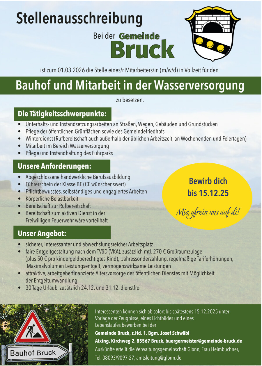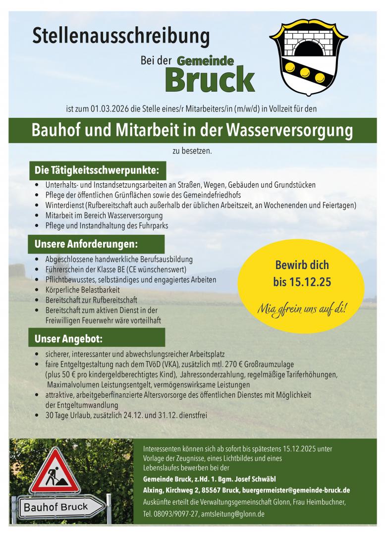 | Mitarbeiter/in (m/w/d) für den Bauhof und die Wasserversorgung Bruck